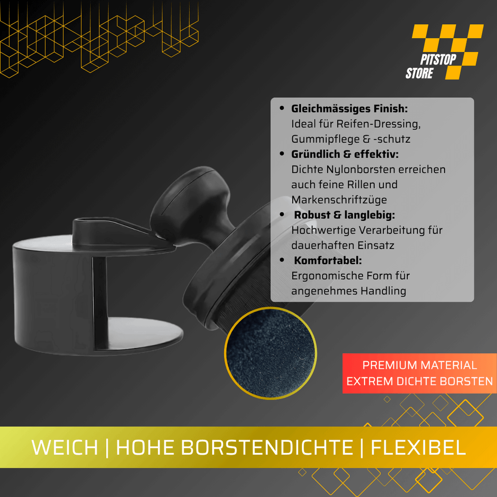 Gleichmässige Anwendung: Die Bürste sorgt dafür, dass das Reifenpflegeprodukt gleichmässig auf die gesamte Reifenoberfläche verteilt wird, was für ein professionelles Ergebnis sorgt.